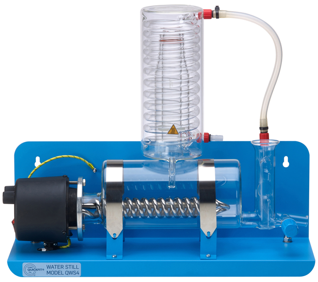 This still lets you produce quality distillate while demonstrating the distillation process through a crystal-clear borosilicate glass boiler and a high-efficiency coil condenser. It is easy to use and safe to operate. A 3kW chromium-plated heater boils the water and the high-efficiency condenser provides distilled water output at 25° to 35°C (minimum water supply flowrate 1L/min.).